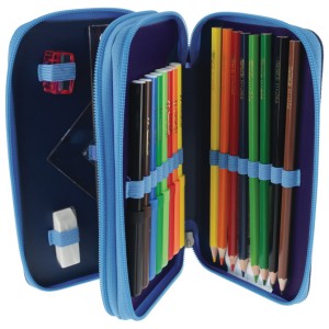 2 zipa; punjena s 23 komada pribora: flomaster školski 8 boja, boje drvene 8 boja, olovka grafitna HB x 2 komada, šiljilo, gumica, ravnalo pvc, trokut i olovka kemijska; dimenzija: 19,3x11,5x4,5 cm